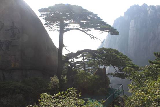 黃山迎客松,800多年的樹(shù)齡,樹(shù)干中部伸出長(zhǎng)達(dá)7.6米的兩大側(cè)枝展向前方,恰似一位好客的主人,揮展雙臂,熱情地歡迎五湖四海的賓客到黃山游覽。